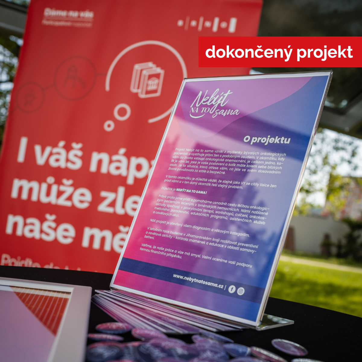 | říjen 2024 | Proběhla prezentace projektu Nebýt na to sama v rámci akce Brněnské onkologické dny na BVV. Plánují se adventní trhy. |